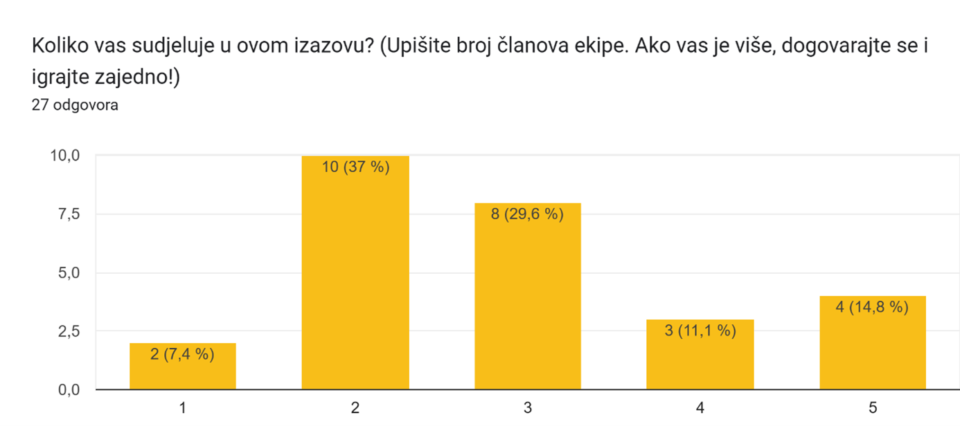 Analiza provedbe obiteljskog izazova pokazala je nekoliko značajnih uvida u načine rješavanja zadataka i oblike suradnje među sudionicima. Ekipe su se vrlo uspješno snalazile u suradničkom pretraživanju i analizi mrežnih izvora. Kada je bilo potrebno pronaći točne informacije u pravilnicima, izvješćima ili galerijama ilustracija, većina je sudionika brzo dolazila do ispravnih rješenja, što ukazuje na razvijene vještine informacijske pismenosti i učinkovitu suradnju u digitalnom okruženju. S druge strane, zadaci koji su zahtijevali sustavno prebrojavanje mogućnosti i analitičko razmišljanje pokazali su se zahtjevnijima te su češće rezultirali pogrešnim zaključcima, što sugerira potrebu za dodatnim poticanjem matematičko-logičkog pristupa problemima. Obiteljski format izazova pokazao se osobito prikladnim jer su dvočlane i tročlane ekipe bile najzastupljenije, što upućuje na to da su roditelji i djeca rado surađivali te zajedno razvijali strategije rješavanja zadataka.