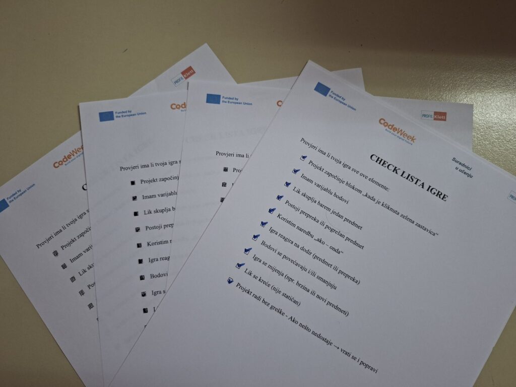 U nastavku radionice učenice su promatrale primjer jednostavne igre u Scratchu te analizirale njezine elemente. Nakon toga su pomoću radnog listića planirale vlastite igre, razmišljajući o likovima, predmetima koje će skupljati, načinu bodovanja te pravilima koja određuju tijek igre. Poseban naglasak bio je na osmišljavanju načina na koji igra može postati izazovnija i zanimljivija, primjerice povećanjem brzine ili uvođenjem novih elemenata ovisno o napretku igrača.