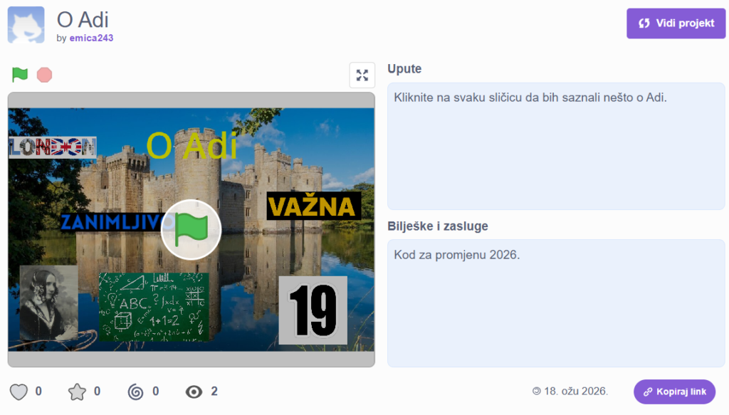 Nakon toga učenice su samostalno ili u paru izradile novi Scratch projekt „O Adi“, u kojem su predstavile osnovne činjenice o Adi Lovelace, programirale likove koji prenose informacije te primijenile već naučene elemente programiranja iz prvog zadatka. Svoje su radove ponovno podijelile na Padletu te su zajedno pregledale projekte i komentirale ih, čime su razvijale i digitalnu komunikaciju i vršnjačko vrednovanje.
