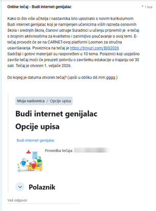 Jedan je od najdugovječnijih projekata udruge Suradnici u učenju Budi internet genijalac koji je ponovo proširio broj svojih suradnika, ambasadora, i škola s kojima surađuje. Koliki je njihov, sad već zavidan broj, otkrit ćete u pitanju ambasadori i škole Budi internet genijalac. Kako bi nove suradnike i njihove škole što bolje upoznali s gotovim materijalima, članovi udruge Suradnici u učenju su pripremili e-tečaj koji se upravo provodi na CARNET-ovoj platformi Loomen za stručna usavršavanja. Poveznica na tečaj je https://tinyurl.com/BIG2026. U pitanju je pod nazivom Online tečaj – Budi internet genijalac se može pročitati da je tečaj otvoren do 28.02.2026.