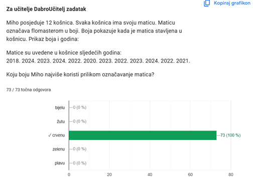Najbolje riješeno pitanje je bio DabroUčitelj zadatak gdje je uspješnost bila 100%.