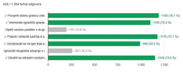 Ovakvo pitanje odabrano je jer djecu ne uči samo prepoznavanju cyberbullyinga, već ih osnažuje da reagiraju pravovremeno, sigurno i bez osjećaja krivnje ili srama. Izvor pitanja su savjeti UNICEF-a, koji naglašavaju važnost zaštite djece u digitalnom prostoru, poticanje traženja pomoći i izgradnju okruženja u kojem se zlostavljanje ne tolerira, a sigurnost i dobrobit djece stavljaju u središte. Većina učenika prepoznala je ispravne postupke poput razgovora s odraslom osobom ili blokiranja nasilnika, ali su neki propustili označiti sve točne odgovore, što im je onemogućilo osvajanje boda.